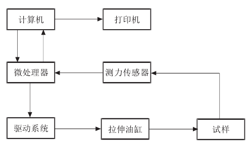 3000 kN拉力试验机主要由试验机主体、驱动系统、测力传感器、电比例调速阀、微处理器、计算机及打印输出设备构成。其中计算机是控制系统的核心,完成人机交互、试验控制、实时监控以及试验总结功能;微处理器用于输出和接收信号、驱动驱动系统;驱动系统是拉力试验机的动力源;拉伸油缸用于试件的拉断;测力传感器是试验机的反馈部件,打印机为试验数据输出装置。